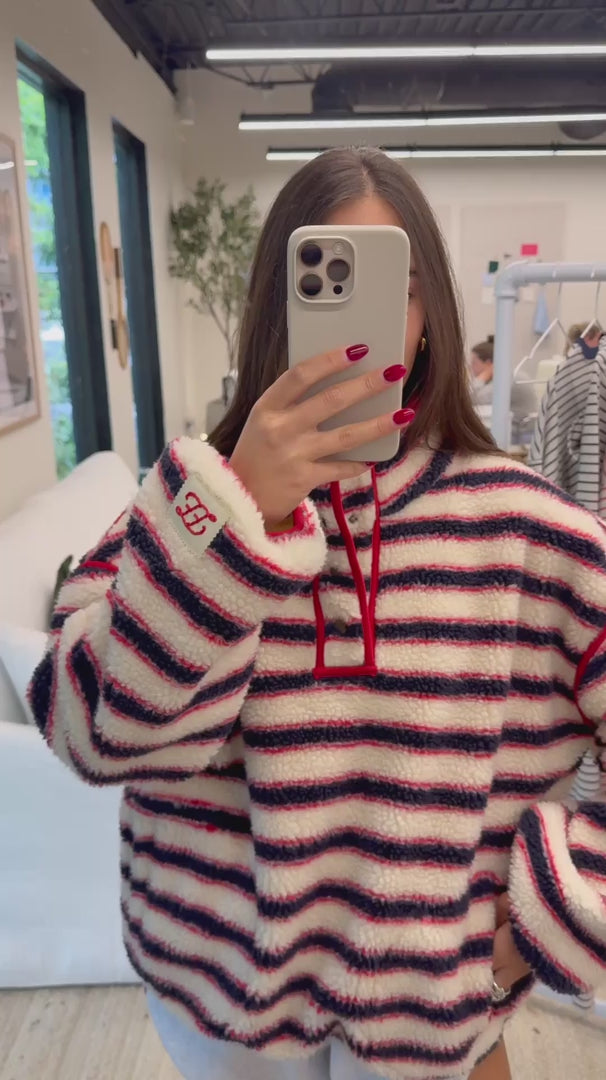 this striped fleece pullover has that boxy fit you love, made for throwing on over leggings or denim when you’re on campus this fall. Cozy, soft sherpa fleece keeps it comfy while the bold stripes make you look instantly put-together. Finished with customized Eleven Eleven buttons, it’s a subtle detail that makes it uniquely ours. It’s the layer you’ll wear to class, coffee runs, and everywhere in between!
